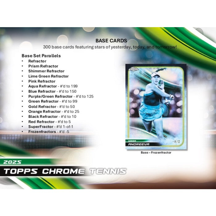 Topps Chrome Tennis returns with a new look featuring some of the greatest names in the game! Look for an all-new design style that will be accentuated with a wide-variety of chase parallels. Find several first-time signers across the autograph subsets.
