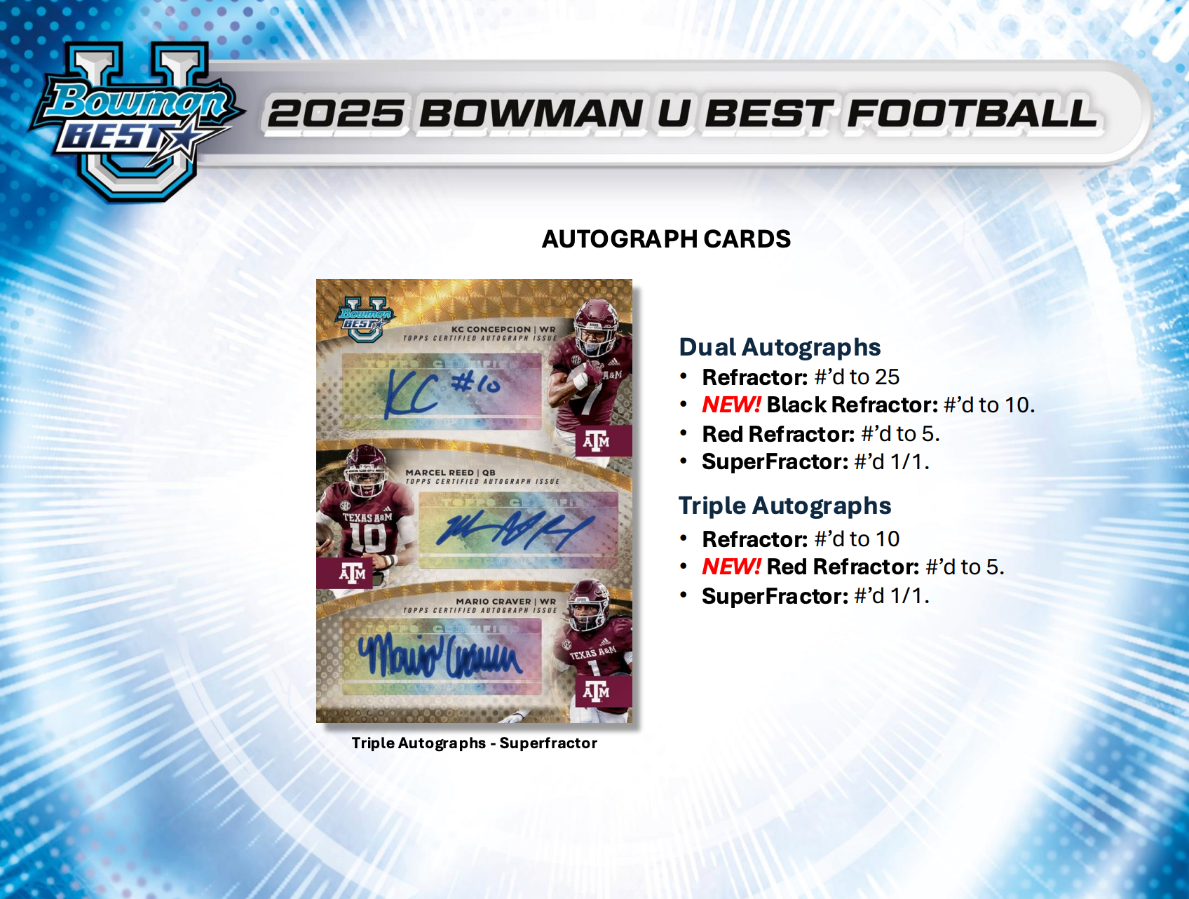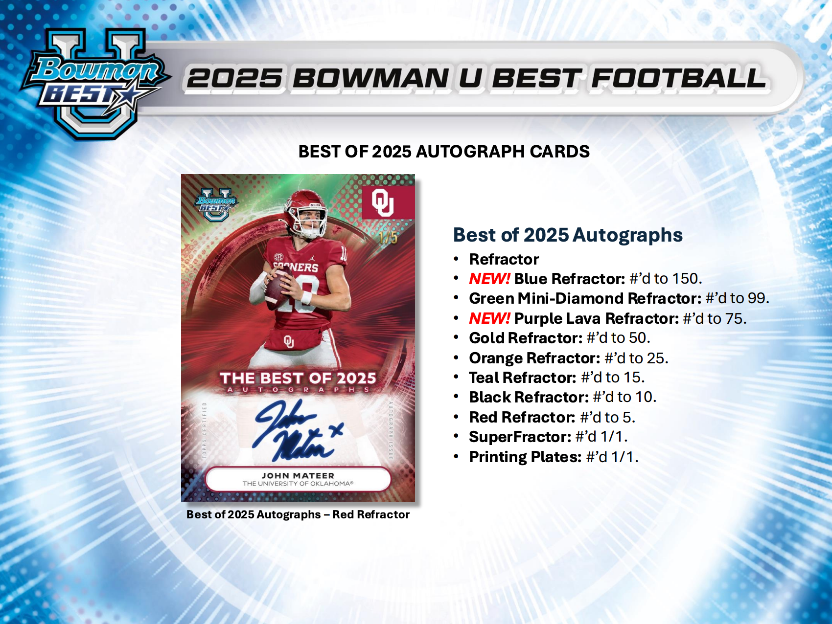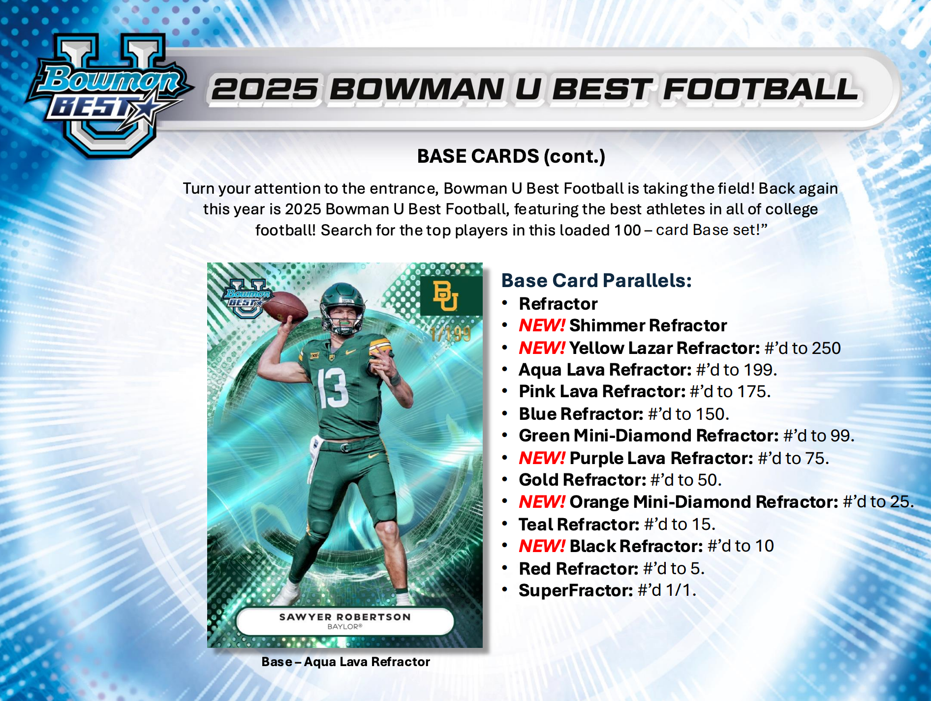 Turn your attention to the entrance, Bowman U Best Football is taking the field! Back again this year is 2025 Bowman U Best Football, featuring the best athletes in all of college football! Search for the top players in this loaded 100 - card Base set!"