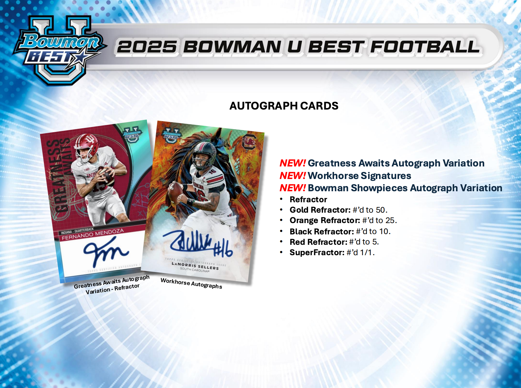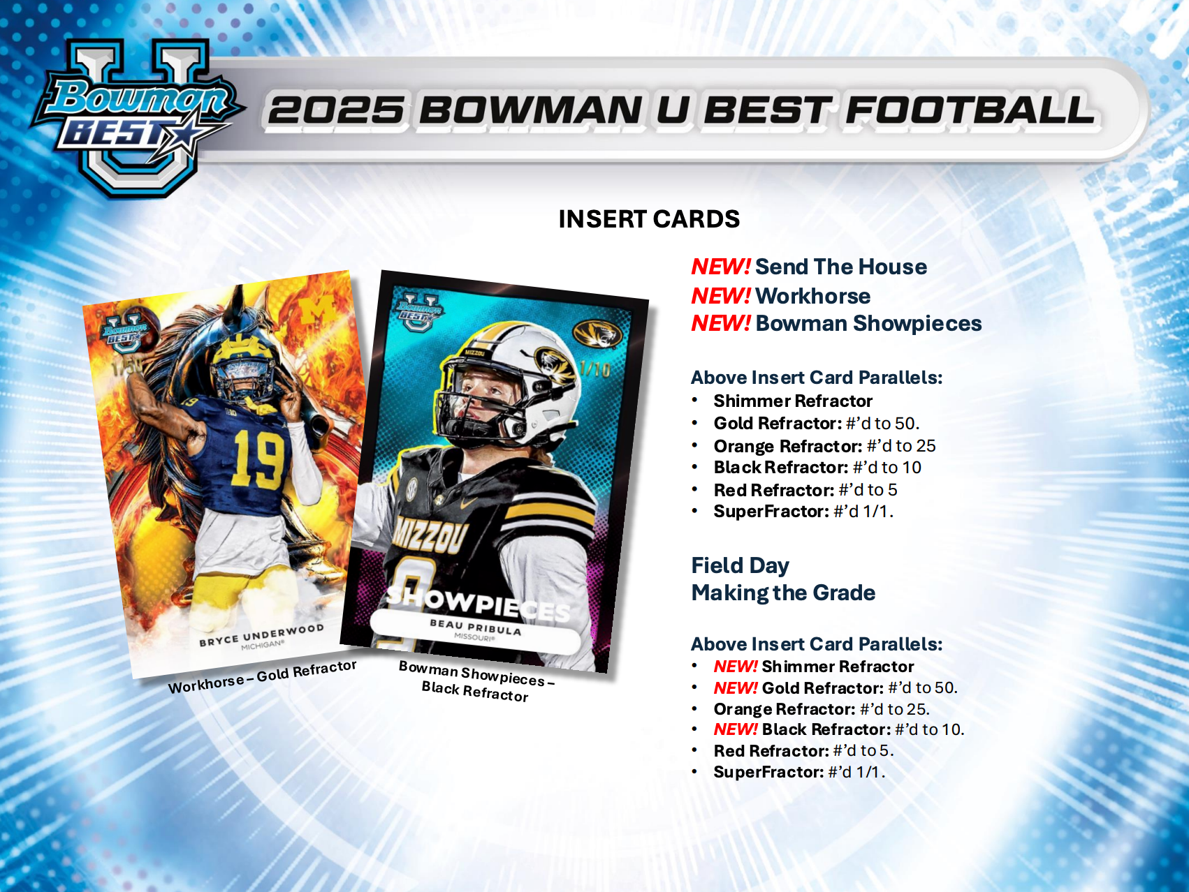 Collectors will uncover a dynamic lineup of all-new inserts that bring the spirit of the game to life. Send The House charges in with defensive heat, Workhorse honors college football's toughest competitors, and Making the Grade showcases academic and athletic excellence. Field Day and Bowman Showpieces bring bold, thematic storytelling to the insert lineup, each designed to elevate your collection with eye-catching art and elite subject matter.
