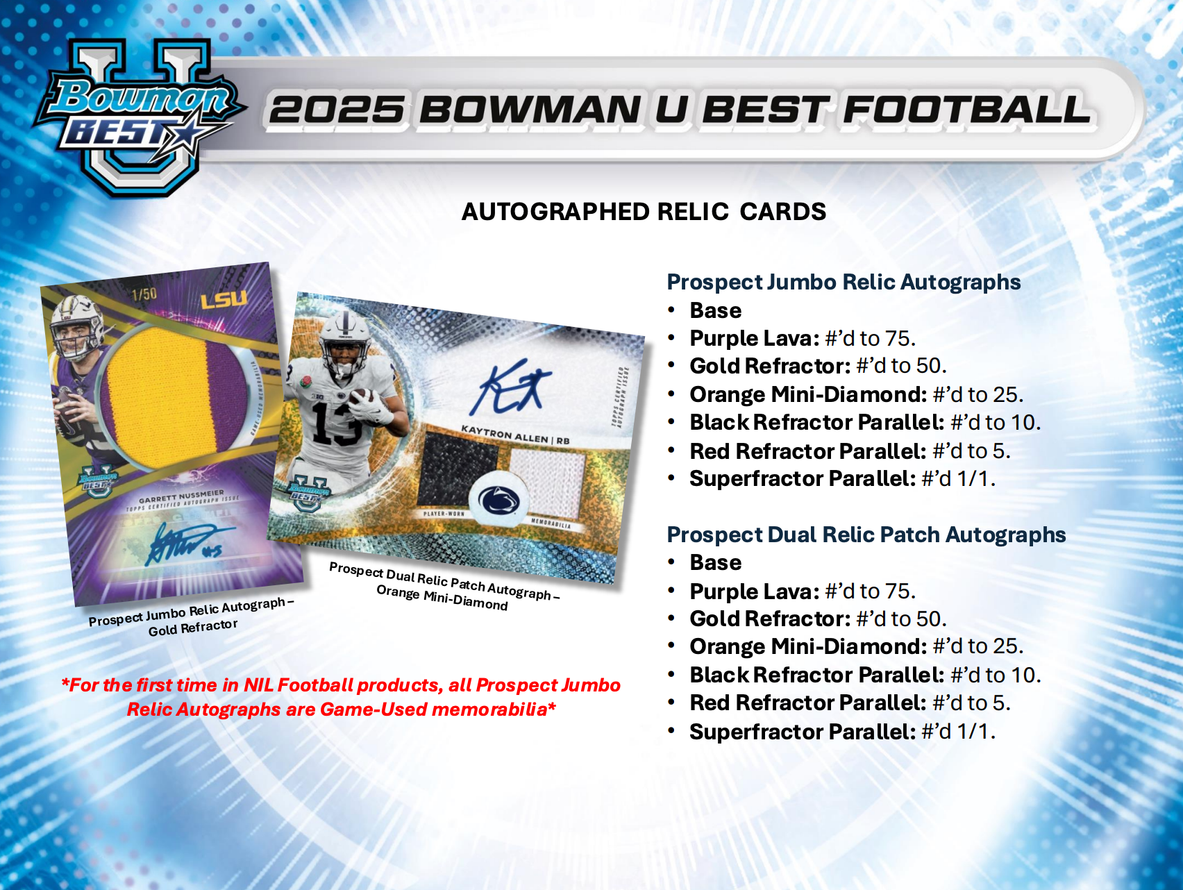 Signature content takes it up a notch with Best of 2025 Autographs featuring 100 top prospects, alongside all-new Greatness Awaits and Workhorse Signatures that spotlight defining moments and future stars. Triple and Dual Autographs, each with limited parallels, offer once-in-a-Hobby combinations, while Jumbo Relic Autographs debut the first-ever Game-Used relic autos in an NIL football product. These hobby-only cards combine authentic game-used memorabilia with autographs from the college game's brightest names, delivering unmatched authenticity and collector appeal. Dual relic autos with low-numbered patch parallels bring even more heat to this historic checklist.