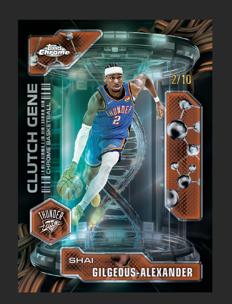 The ultimate chase: Gold NBA Logoman Relics. Each card features a Gold NBA Logoman patch #/4 from early-season jerseys worn by the league’s three top award winners: MVP Shai Gilgeous-Alexander, Rookie of the Year Stephon Castle, and Defensive Player of the Year Evan Mobley. Look for on-card 1-of-1 autograph variations—the crown jewel of the collection.