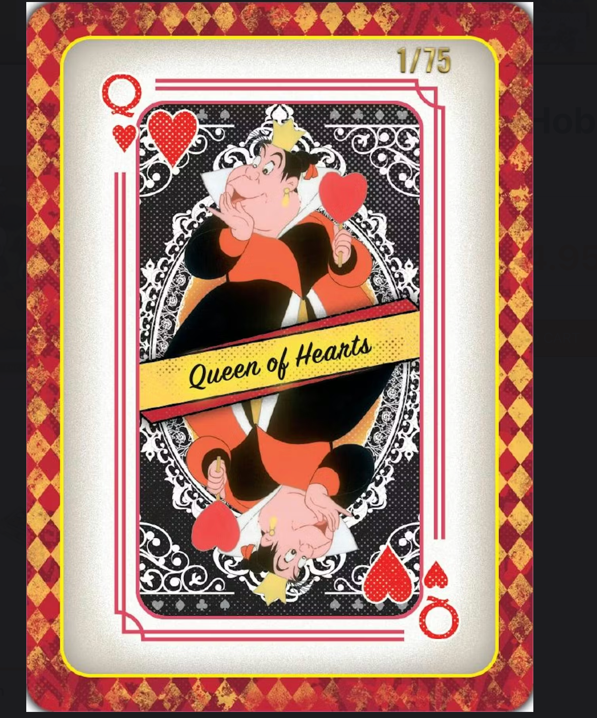 One of the most creative inserts in the product is Queen of Heart's deck. Inspired by the Queen of Hearts, this insert builds a full 52-card playing deck. Each card represents a suit and number or face from a traditional deck, all reimagined through the lens of Disney. The cards are printed on acetate and carry a premium feel, making the full deck a must-have for both Alice and Wonderland fans and collectors who enjoy one-of-a-kind concepts. #'d to 125