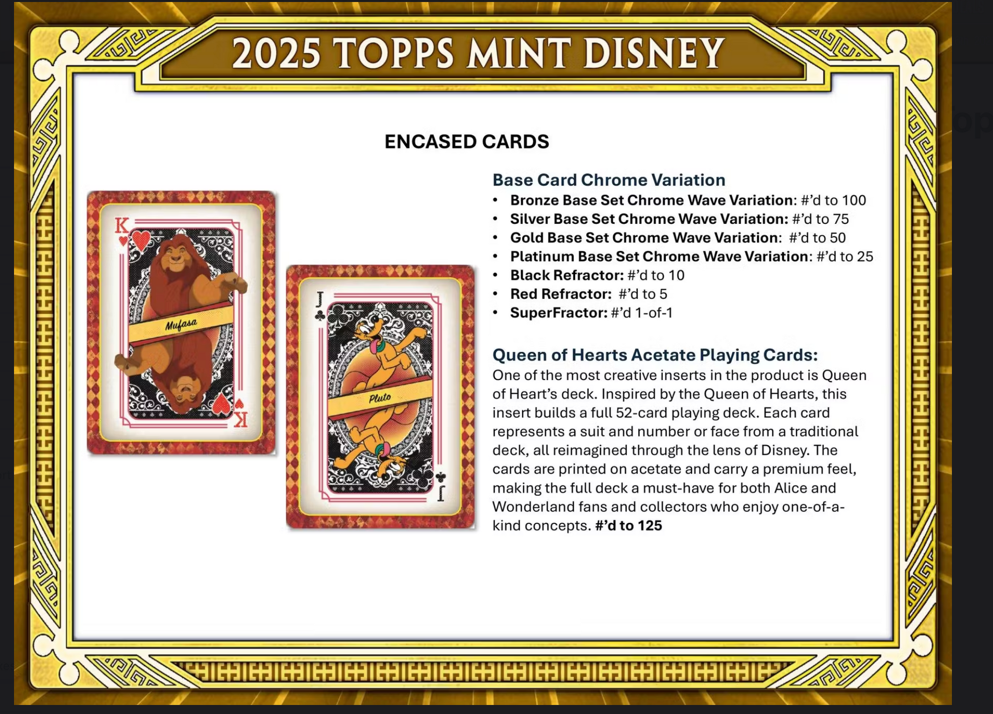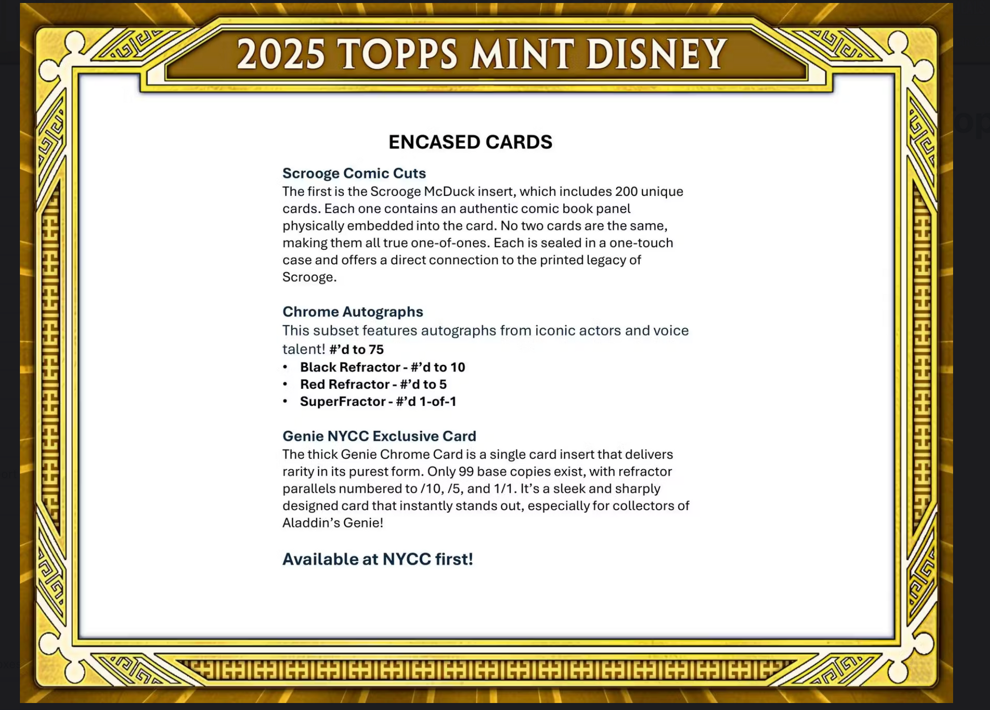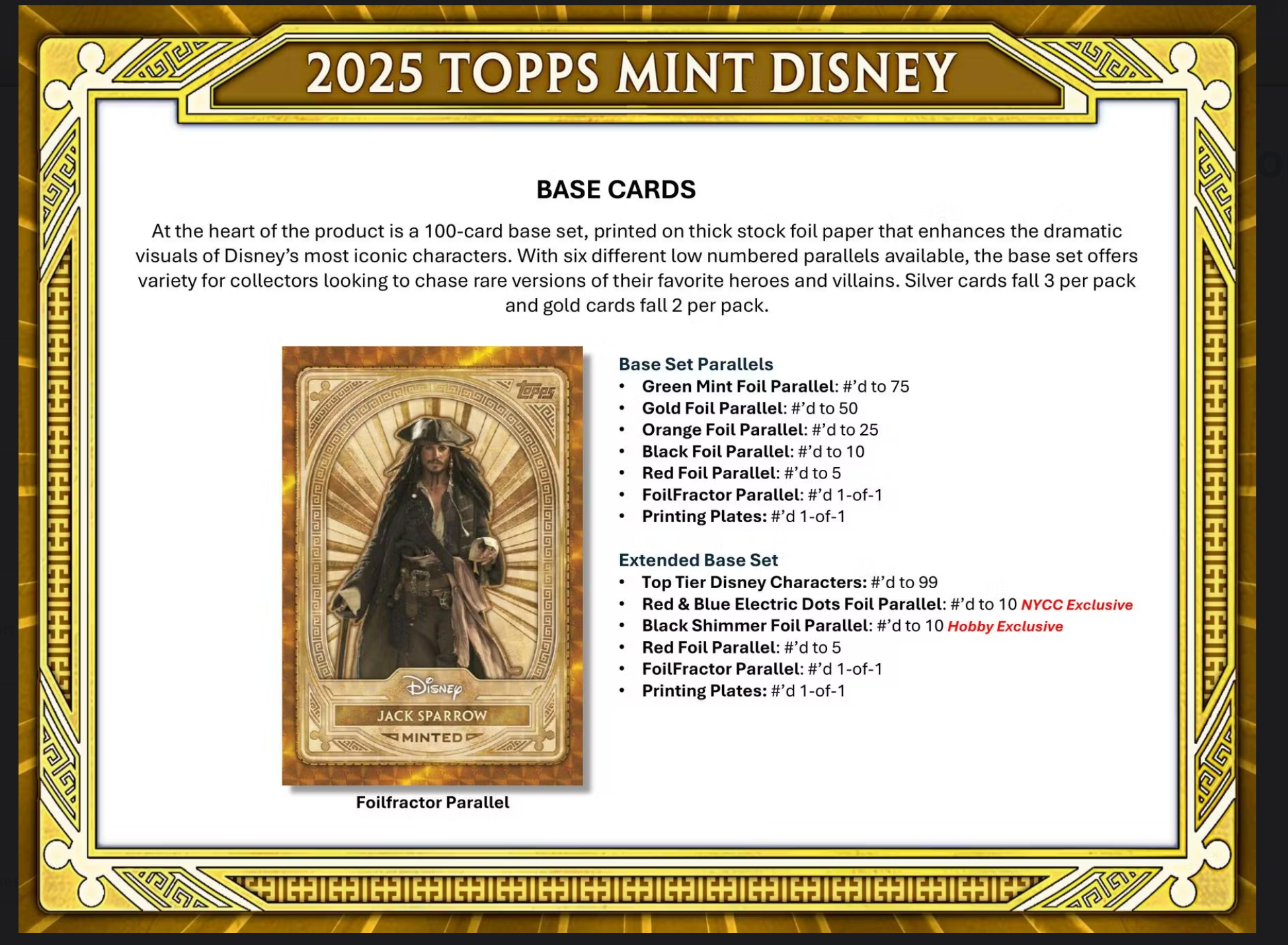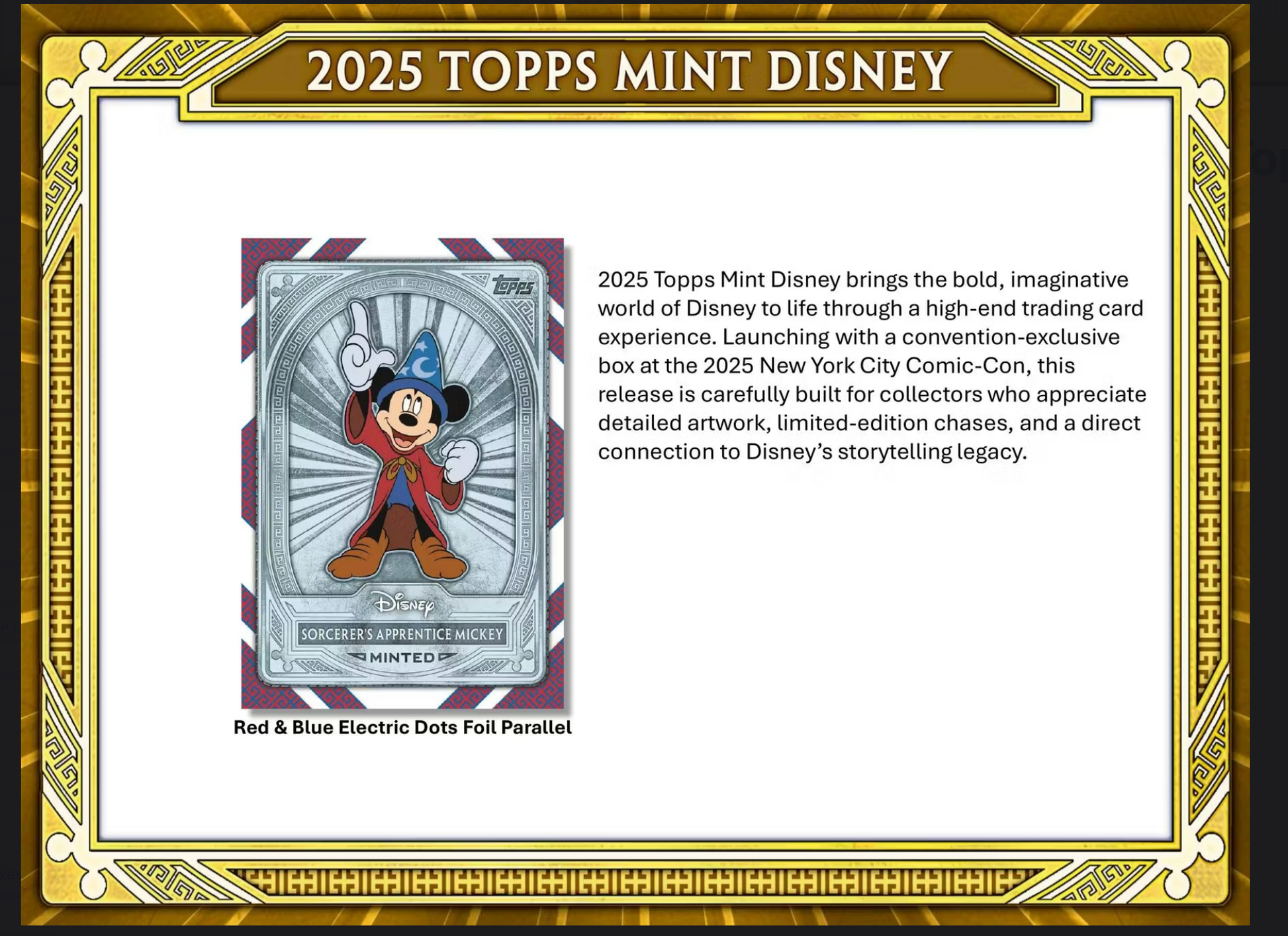2025 Topps Mint Disney brings the bold, imaginative world of Disney to life through a premium trading card experience. Launching with a convention-exclusive box at the 2025 New York City Comic Con, this high-end release is crafted for collectors who appreciate exquisite artwork, limited-edition chases, and a true connection to Disney's storytelling legacy.