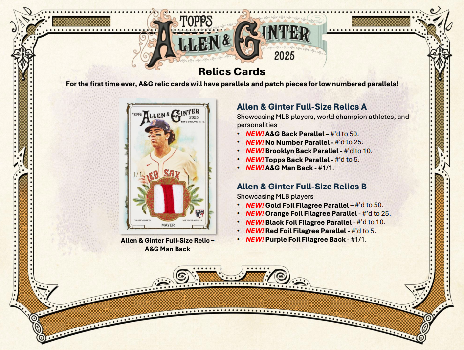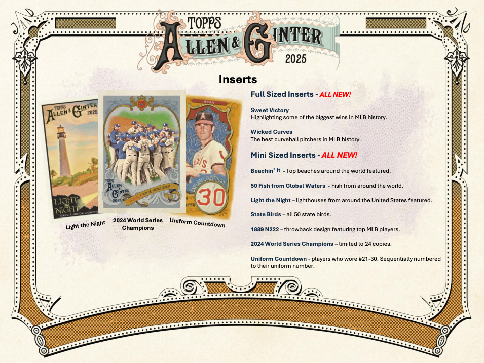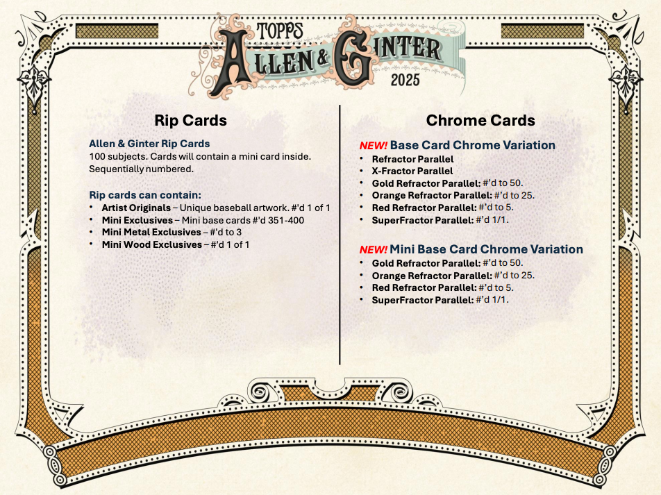 Each pack contains fourteen (14) 2025 Allen and Ginter Baseball cards: nine (9) Base cards, two (2) Mini Base Cards, one (1) FullSize Short Print Base card, and two (2) Full-Size Insert cards.