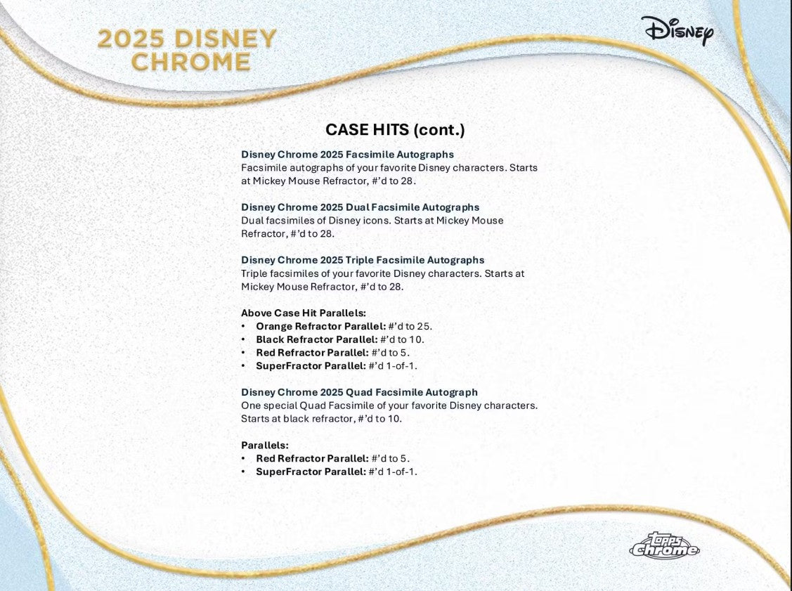 The wonder of Disney meets the magic of Topps in this all-new Disney Chrome 2025 trading card set. All your favorites are here on stunning Chrome tech and for the first time, we're proud to present rare authentic autograph cards of some of the greatest live action and voice talent from the epic history of Disney and Pixar.