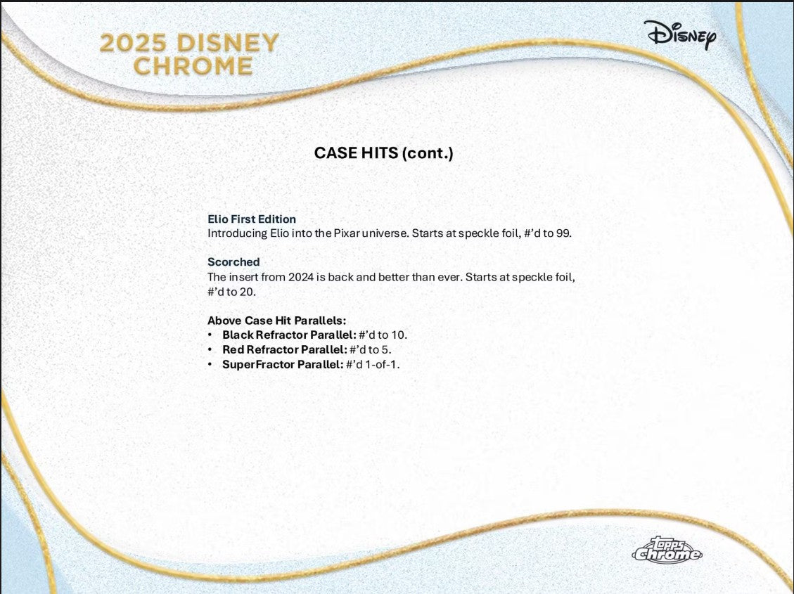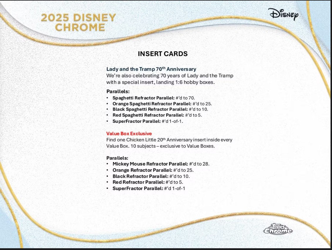 Collect the 200-card base set on stunning Chrome tech. All your favorite Disney and Pixar characters are here - plus, for the first time, look for base cards of Disney Live Action heroes. Also look out for special inserts and incredible sketch cards. This, plus much more, in 2025 Disney Chrome!