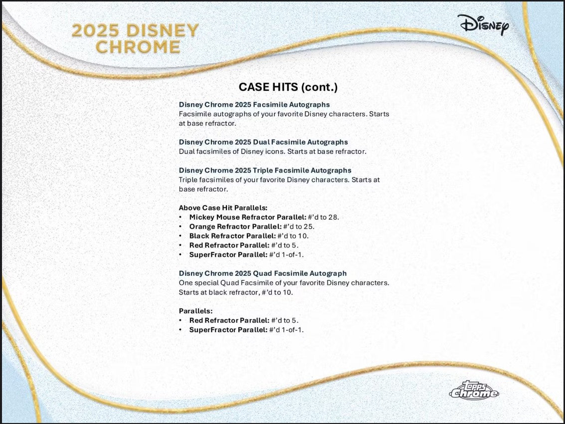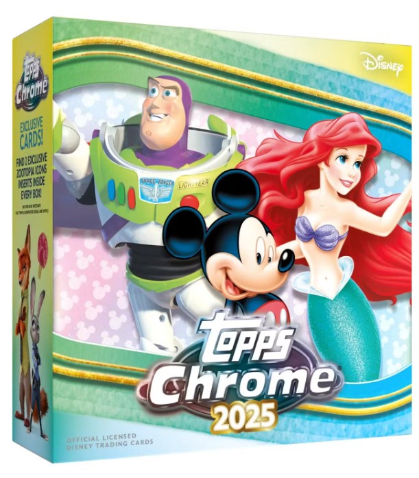 The wonder of Disney meets the magic of Topps in this all-new Disney Chrome 2025 trading card set. All your favorites are here on stunning Chrome tech and for the first time, we're proud to present rare authentic autograph cards of some of the greatest live action and voice talent from the epic history of Disney and Pixar.