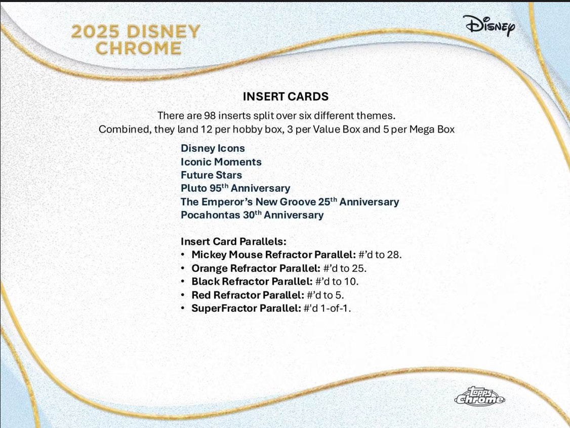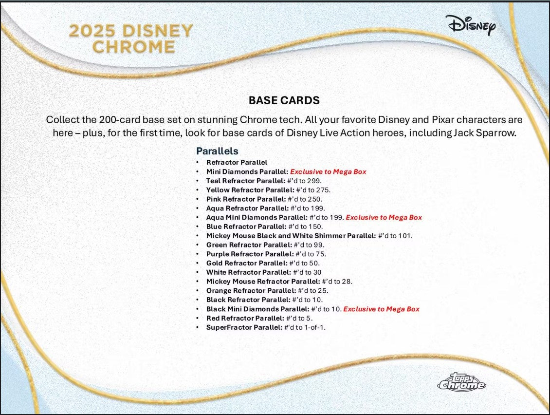 Collect the 200-card base set on stunning Chrome tech. All your favorite Disney and Pixar characters are here - plus, for the first time, look for base cards of Disney Live Action heroes. Also look out for special inserts and incredible sketch cards. This, plus much more, in 2025 Disney Chrome!