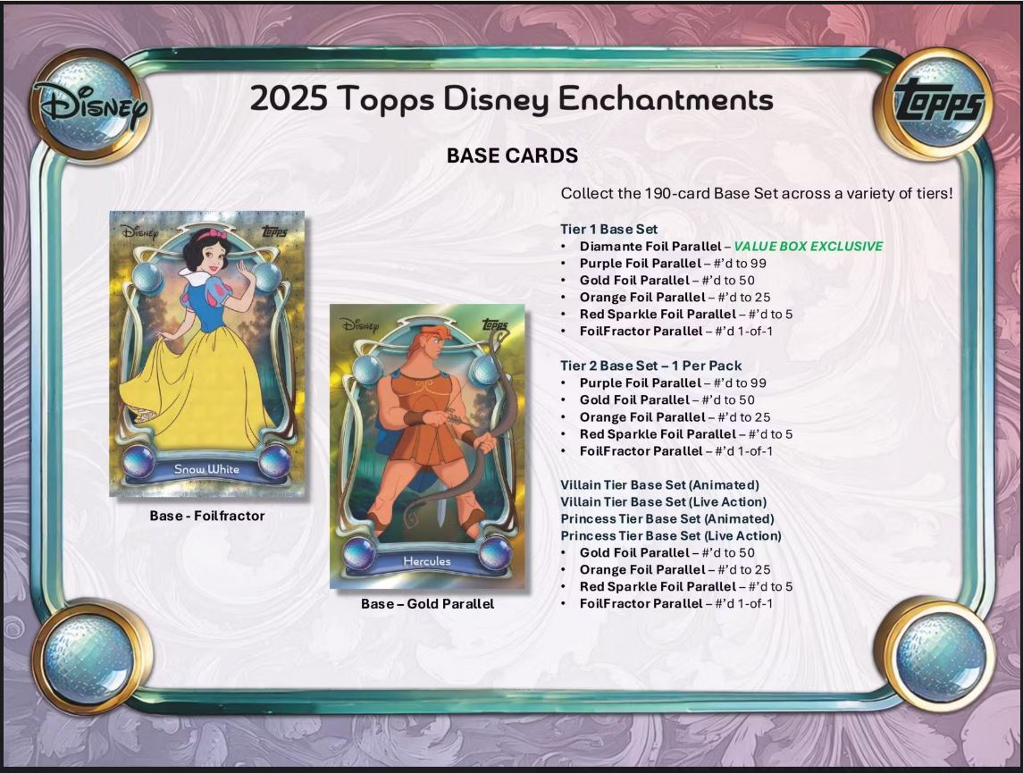 This enchanting collection features a 190-card tiered base set across specially designed Tier 1, Tier 2, Villain, and Princess tiers. From beloved heroes and princesses to royalty and infamous villains, Disney Wonder brings the entire Disney universe to life in stunning new designs.