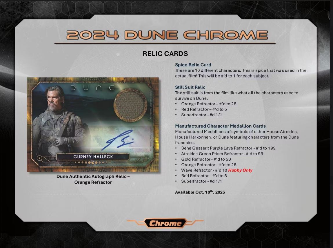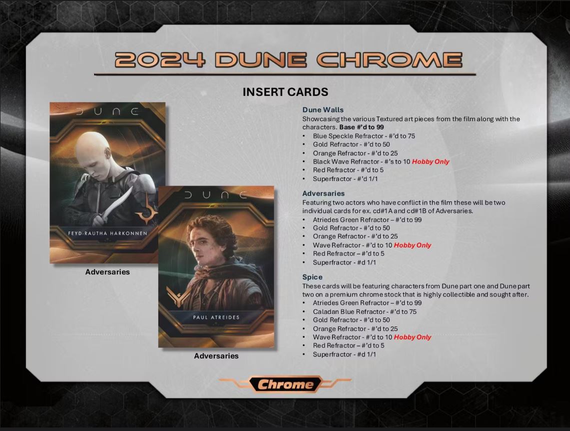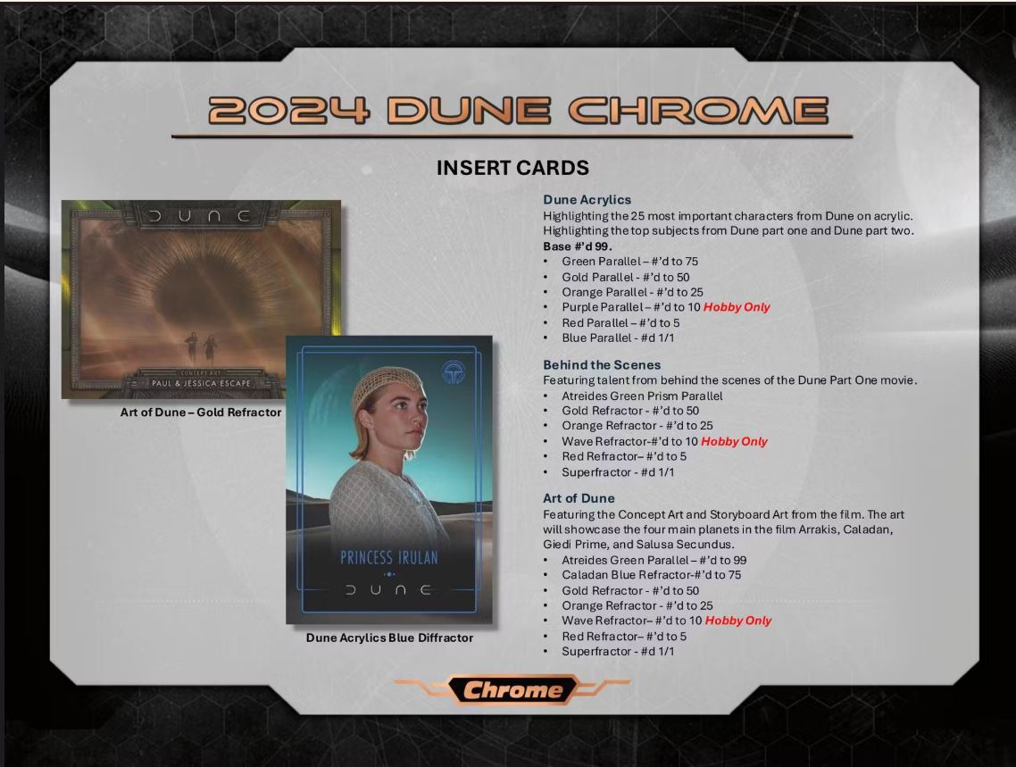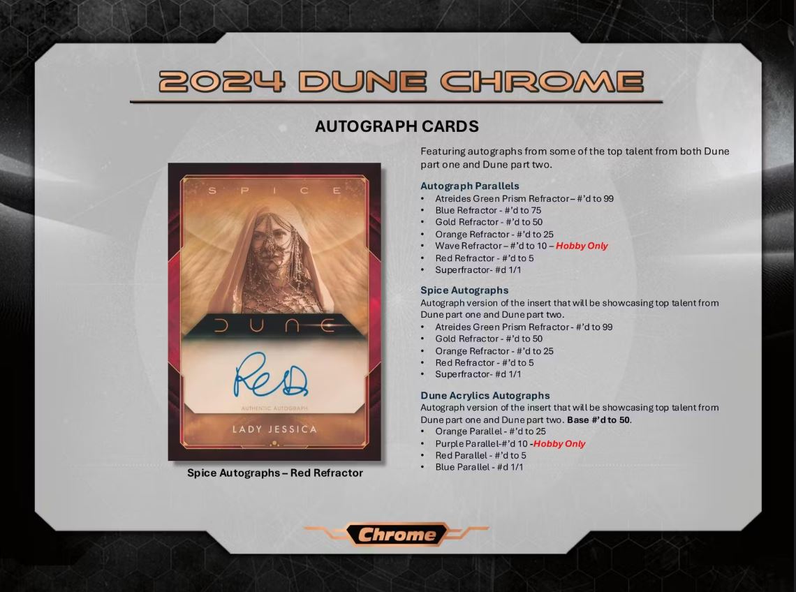 2024 Dune Chrome marks the first-ever Chrome trading card product for the 6x Oscar Winning Film filled with elite talent autographs and a variety of collectible card technology. Starting with an amazing packaging, this product includes one autograph or sketch every other hobby box and the ultimate chase hits SPICE cards with actual spice used in the film. We are offering many unique inserts like Spice, Dune Acrylics, and Art of Dune inserts along with many more.