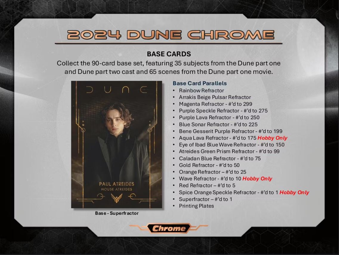 2024 Dune Chrome marks the first-ever Chrome trading card product for the 6x Oscar Winning Film filled with elite talent autographs and a variety of collectible card technology. Starting with an amazing packaging, this product includes one autograph or sketch every other hobby box and the ultimate chase hits SPICE cards with actual spice used in the film. We are offering many unique inserts like Spice, Dune Acrylics, and Art of Dune inserts along with many more.