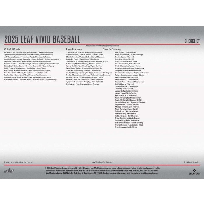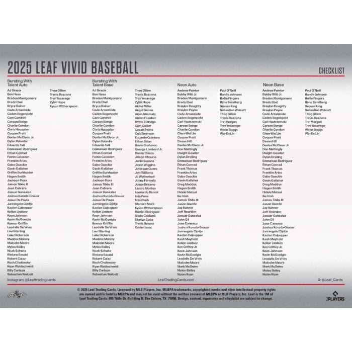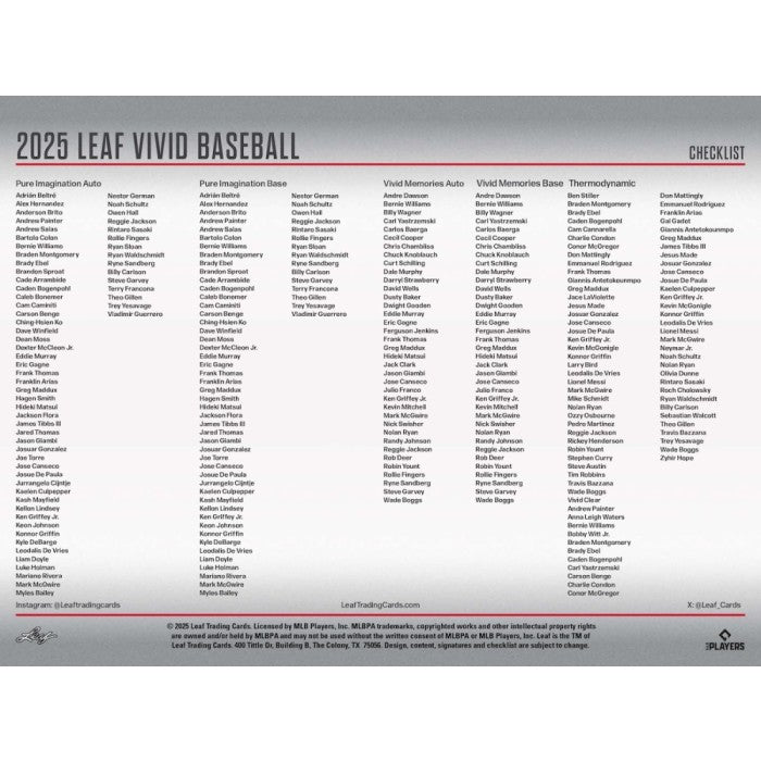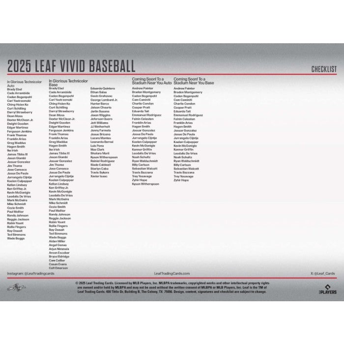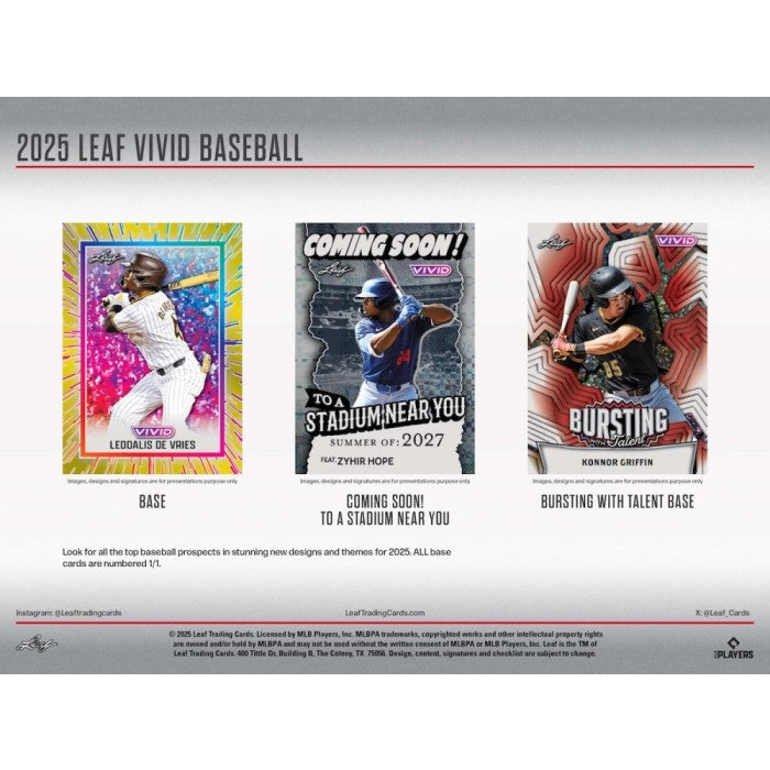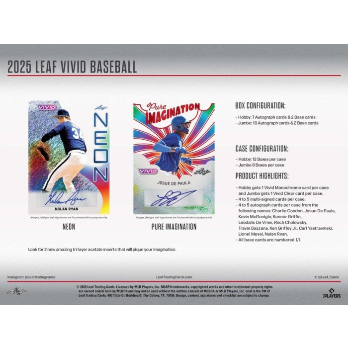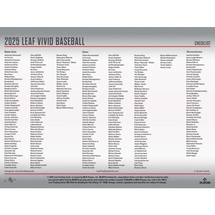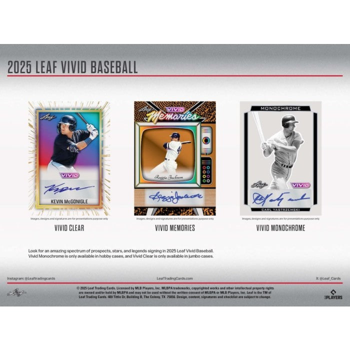 Look for an amazing spectrum of prospects, stars, and legends signing in 2025 Leaf Vivid Baseball. Vivid Monochrome is only available in hobby cases, and Vivid Clear is only available in jumbo cases.