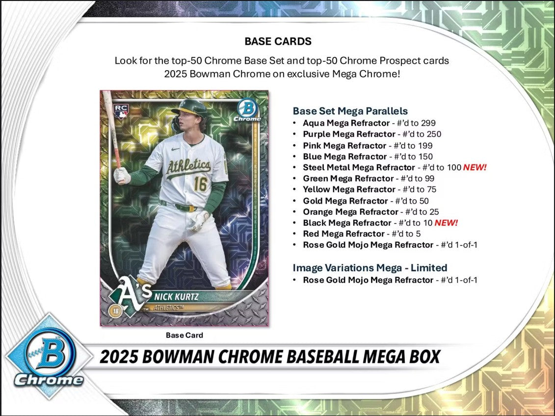 Collectors can chase a vibrant array of Mega Refractors, including Aqua, Purple, Pink, and Blue, along with new Steel Metal and Black Mega Refractors, and the ultra-rare Rose Gold Mojo Mega Refractor numbered 1-of-1. Inserts like Meteoric Rise and Bowman Ascensions bring fresh energy with expanded color tiers. Chrome Prospect Mega Autographs return with new parallel colors, and the all-new Bowman Rookie Mega Autograph Variations deliver big hits in Gold, Orange, Black, Red, and 1-of-1 Rose Gold Mojo.