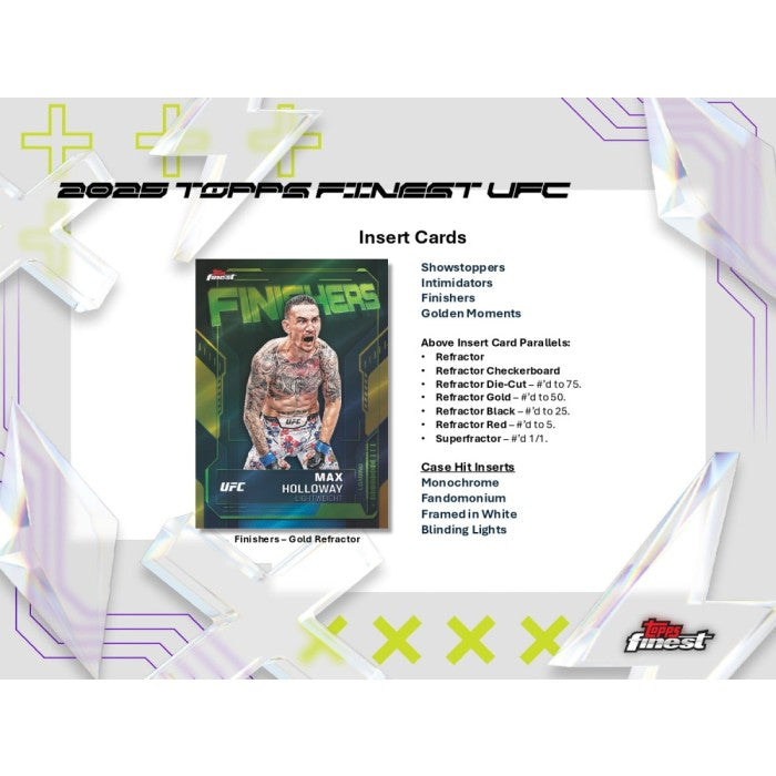 After a successful return to the hobby in 2024, Finest is back. 2025 Topps Finest UFC is bigger and bette than ever in 2025 and features a wide variety of autographs, inserts, refractors and brand-new case hits!